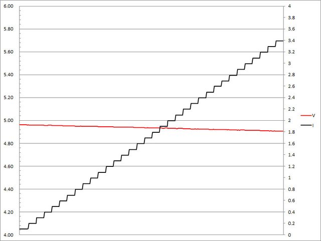 ▼固定檔5V輸出負載測試,隨著電流增加,輸出電壓下降,輸出電流超過3.4A截止