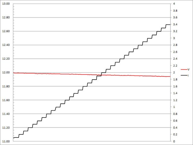 ▼固定檔12V輸出負載測試,隨著電流增加,輸出電壓下降,輸出電流超過3.4A截止