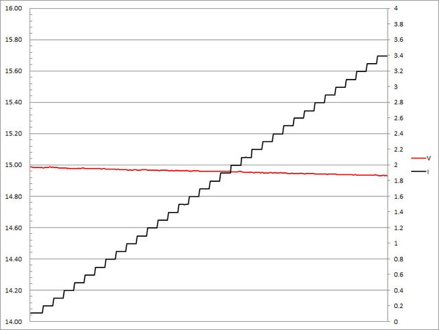 ▼固定檔15V輸出負載測試,隨著電流增加,輸出電壓下降,輸出電流超過3.4A截止