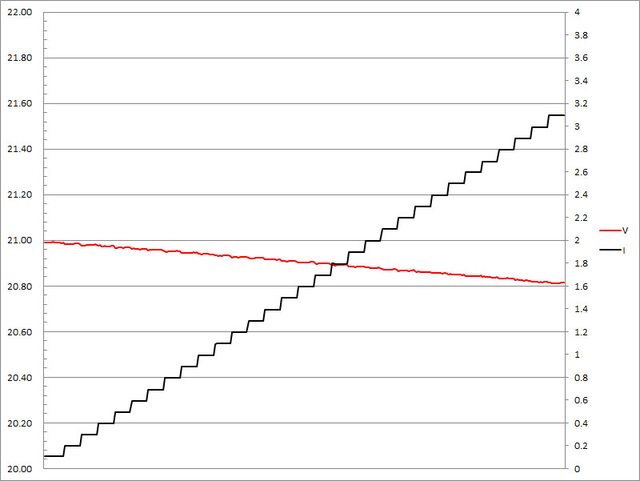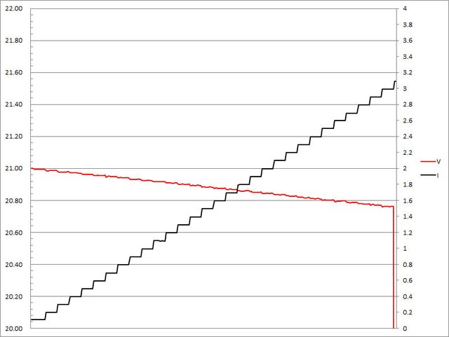 ▼搭配3A線材的PPS檔21V輸出負載測試,隨著電流增加,輸出電壓下降,輸出電流超過3A