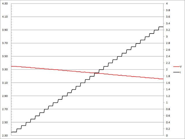 ▼搭配3A線材的PPS檔3.3V輸出負載測試,隨著電流增加,輸出電壓下降,輸出電流超過