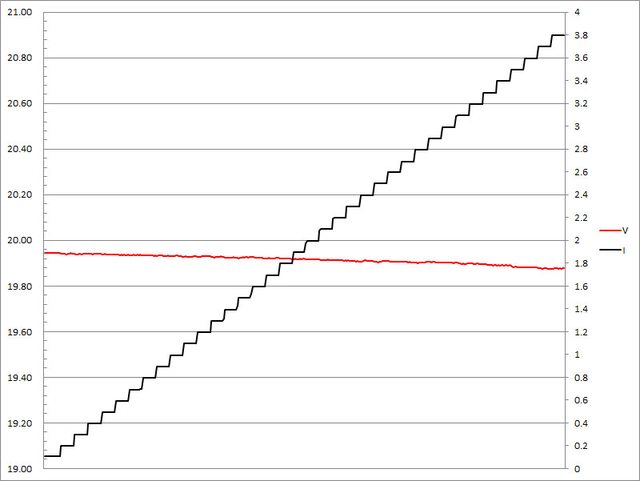 ▼搭配5A線材的固定檔20V輸出負載測試,隨著電流增加,輸出電壓下降,輸出電流超過