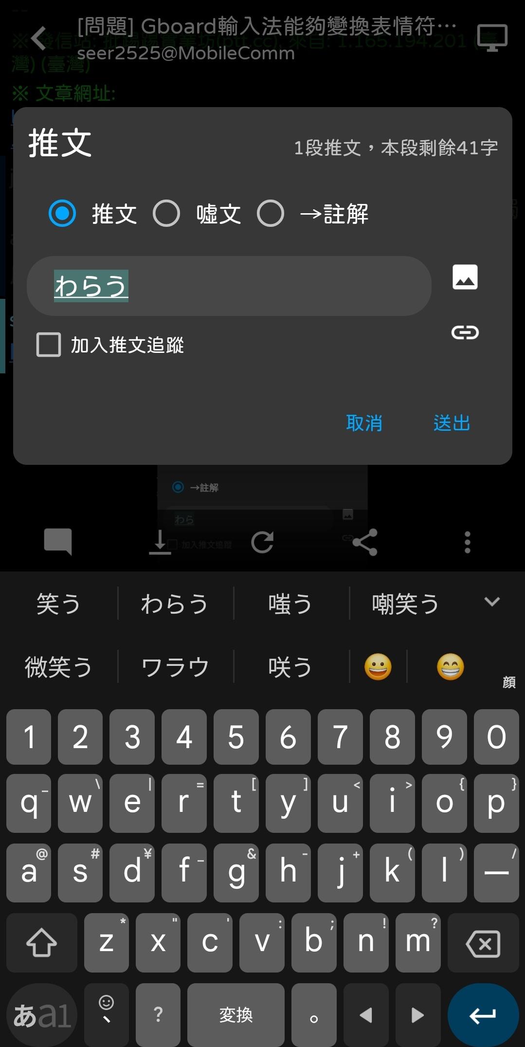 → rex510 : 看一下設定裡面有一個表情符號-->輸入時顯示建議, 04/23 22:27