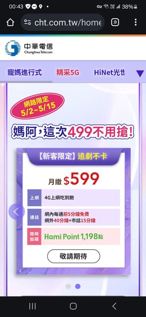 : 先感謝本版資訊跟原PO,成功續約599 4G不限速+送hami 點數
