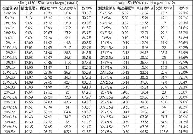 ▼USB-C1/USB-C2單獨使用下各組輸出轉換效率表,整體輸出轉換效率在77.7%至91.5%之
