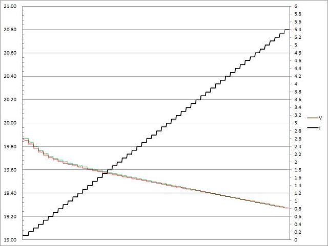 ▼USB-C1(紅)/USB-C2(綠)搭配5A線材的PPS檔3.3V輸出負載測試,隨著電流增加,輸出電