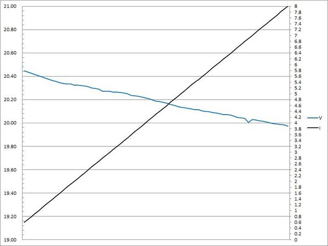 ▼DC插座輸出負載測試,隨著電流增加,輸出電壓下降,輸出電流超過9.6A截止(圖表只
