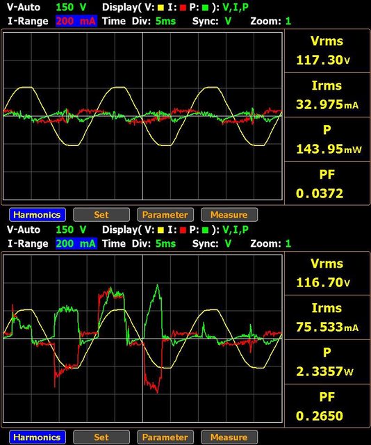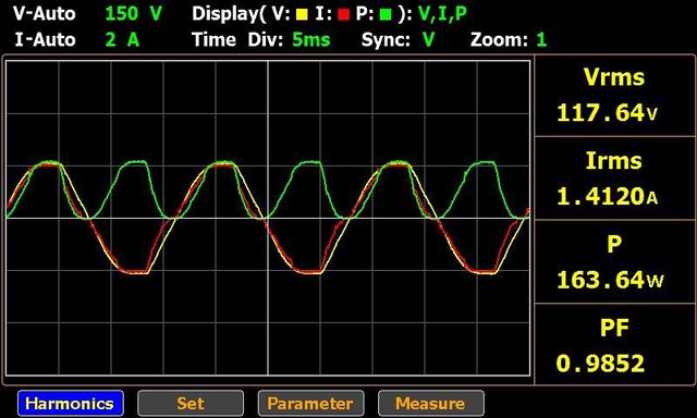 ▼DC插座輸出150W的交流輸入電壓/電流/功率波形如下圖所示,此時功率因數0.9852