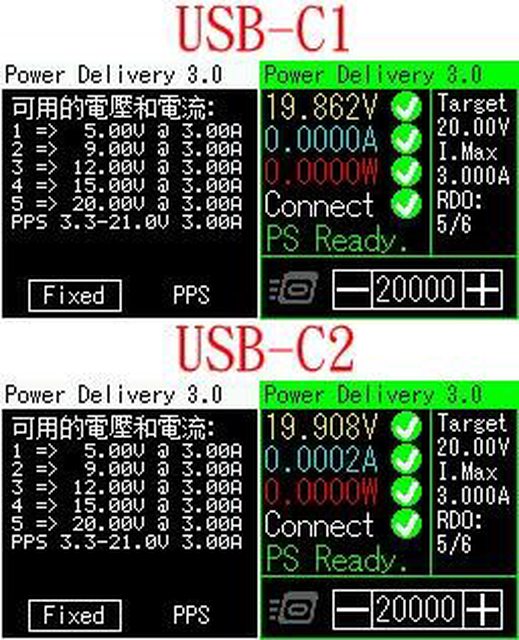 20V/5A,PPS檔雖然表列3.3V-21V/3A,不過最高輸出電壓只能升到19.7V(C1)/19.9V(C2)