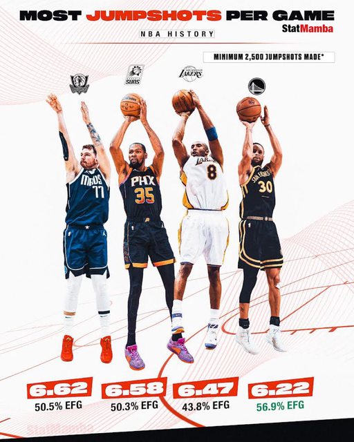 https://twitter.com/StatMamba/status/1763284631699210711 Most jumpshots per game in NBA history: 6.62 — Luka Doncic (50.5% EFG) 6.58 — Kevin Durant (50.3% EFG) 6.47 — Kobe Bryant (43.8% EFG) 6.22 — Steph Curry (56.9% EFG) NBA歷史上場均跳投進球最多的球員: Luka - 6.62 (50.5% EFG) KD - 6.58 (50.3% EFG) Kobe - 6.47 (43.8% EFG) Curry - 6.22 (56.9% EFG) (生涯至少2500顆跳投進球) http://i.imgur.com/lYzYoZN.jpg