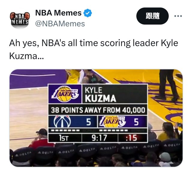 Ah yes, NBA's all time scoring leader Kyle Kuzma... 湖人主場對陣巫師的比賽,轉播方比賽途中誤植湖人球員Kuzma差38分就拿到4萬分 https://x.com/NBAMemes/status/1763432561240428641?s=20 眼睛要多大才能錯成這樣.. -- ※ 發信站: 批踢踢實業坊(www.ptt-website.tw), 來自: 42.72.61.224 (臺灣) ※ 文章網址: https://www.ptt-website.tw/NBA/M.1709270334.A.CF7