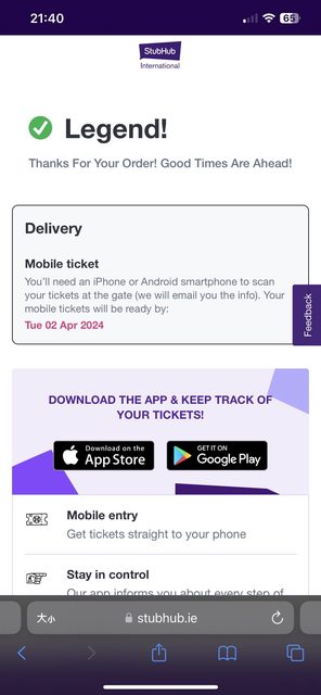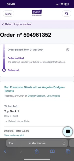 推 ken3616001 : 我有買完立刻出現,也有當天早上才收到的,StubHub 04/02 22:28