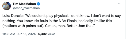 來源:https://bit.ly/3yZcr9H Doncic: I don't want to say nothing, but six fouls in the NBA Finals . . . like this? Come on, man. Be better than that." 今日077犯滿,077賽後說 077:我不想說什麼,但NBA總冠的六次犯規是這樣吹的? 老兄加油點,可以做的更好。 此為077生涯第3次犯滿,季後賽首次 -- ※ 發信站: 批踢踢實業坊(www.ptt-website.tw), 來自: 39.14.1.58 (臺灣) ※ 文章網址: https://www.ptt-website.tw/NBA/M.1718249679.A.A52