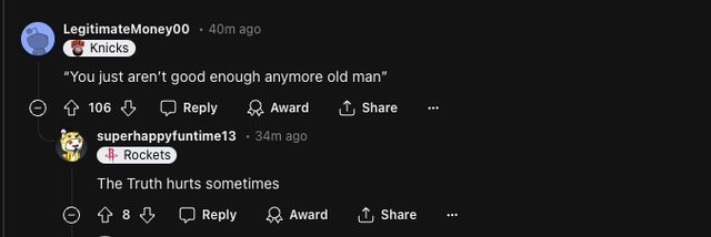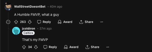 A Humble FMVP, what a guy 真是一位謙虛的 FMVP,太棒了 That’s my FMVP 這才是我的 FMVP "You just aren’t good enough anymore old man" 你已經不夠好了,老傢伙 The Truth hurts sometimes 有時候真相令人難過 備註 https://i.imgur.com/KGlTGyA.jpg