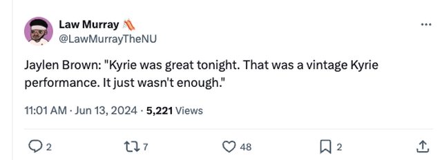 Law Murray, The Athletic Jaylen Brown: "Kyrie was great tonight. That was a vintage Kyrie performance. It just wasn't enough. Jaylen Brown:「Kyrie 今晚表現很棒,那是典型的 Kyrie 表現。但這還不夠。」 reddit留言 https://i.imgur.com/Kf2W5tW.png https://i.imgur.com/fA2WZZt.png
