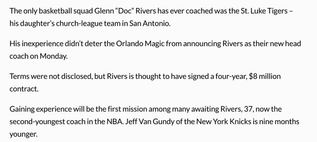 Glenn "Doc" Rivers生涯執教過的球隊只有聖路克老虎--他女兒的球隊 但他的缺乏經驗並沒有阻止奧蘭多魔術星期一雇用他為下一任總教練 合約細節還沒被揭露 但Rivers被認為簽下了一紙4年8M的合約 獲得經驗將會是聯盟第二年輕37歲的Rivers接下來該達成的多項任務中的首要 紐約尼克的 教練Jeff Van Gundy比他小9個月。 (老河後來被魔術開除才變成ESPN的球評就是) 老河也出道即巔峰拿下該年的COY 也是他整個執教生涯的唯一一座 -- ※ 發信站: 批踢踢實業坊(www.ptt-website.tw), 來自: 98.217.185.18 (美國) ※ 文章網址: https://www.ptt-website.tw/NBA/M.1719003735.A.C09