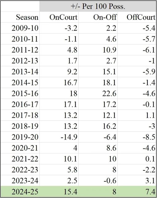 如Payton本賽季搭檔最久的隊友就是Curry。但Curry今年在場百回合贏15.4分,在生涯裡