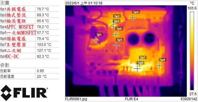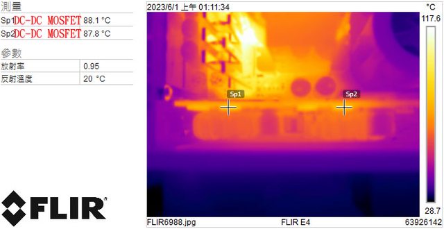 ▼電源供應器滿載輸出下DC-DC MOSFET的紅外線熱影像圖(附註:安裝位置環境溫度會影