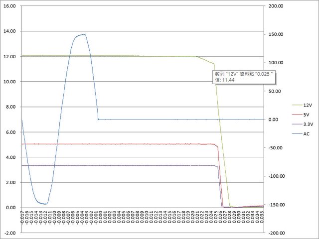 ○綜合全負載輸出狀態切斷AC輸入模擬電力中斷,12V於25ms降至11.44V