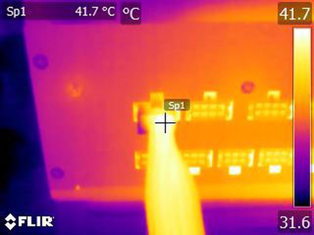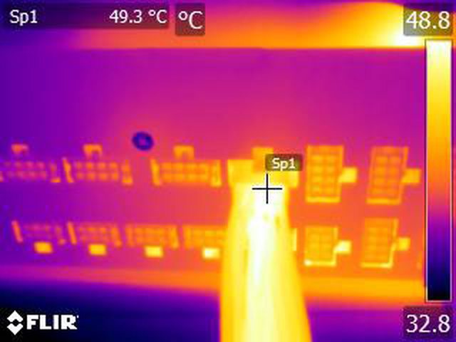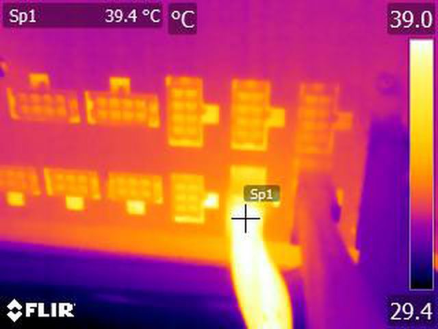 ▼執行FURMARK 30分鐘後,電源端插頭的紅外線熱影像圖(附註:安裝位置環境溫度會影