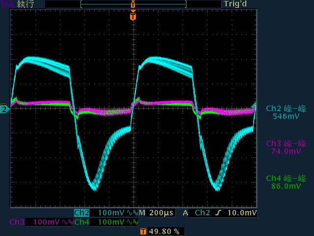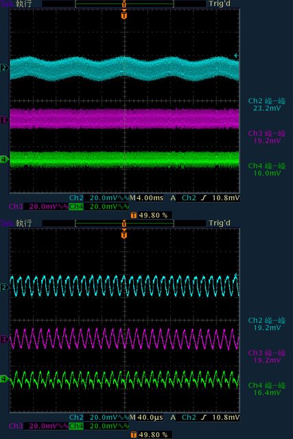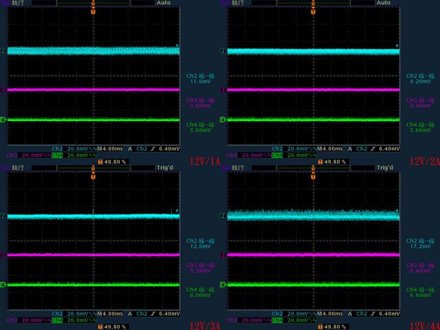 12V漣波波形固定,只改變振幅。於綜合全負載輸出下12V/5V/3.3V各路低頻漣波分別為