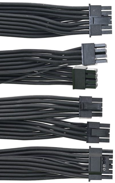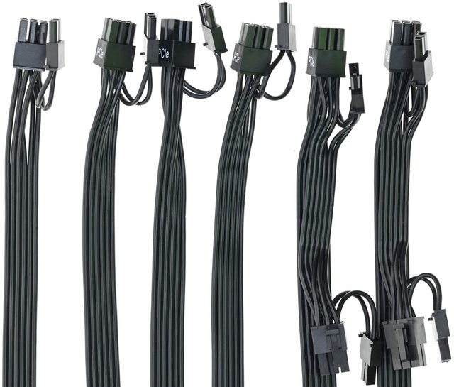 ▼6條顯示卡電源黑色帶狀模組化線路,提供8個PCIE 6+2P接頭,4條為單接頭配置,線路