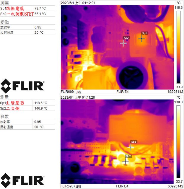 ▼電源供應器滿載輸出下諧振電感/一次側MOSFET(上圖)及主變壓器/二次側(下圖)的紅外