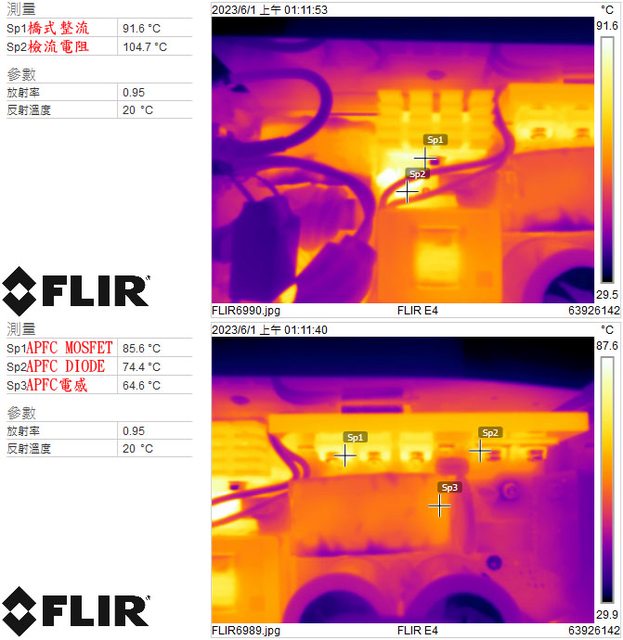 ▼電源供應器滿載輸出下橋式整流/檢流電阻(上圖)及APFC MOSFET/APFC DIODE/APFC電感