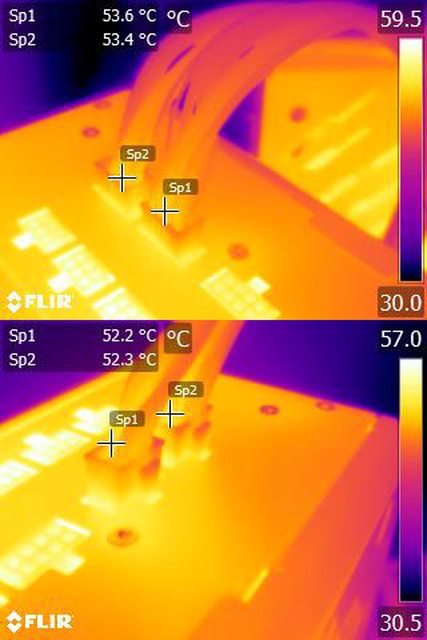 ▼執行FURMARK 30分鐘後,顯示卡端插頭的紅外線熱影像圖(附註:安裝位置環境溫度會