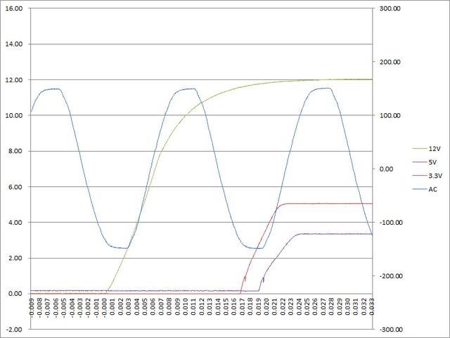 ○電源啟動至綜合全負載輸出狀態,12V上升時間27ms,5V上升時間5ms,3.3V上升時間