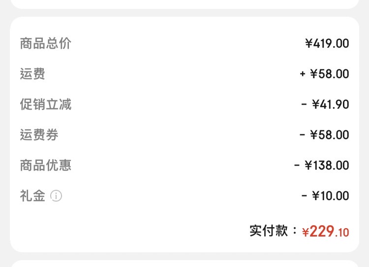369*0.9九折+58運費-20運券-10運券-138新人券=222(約台幣千元)
