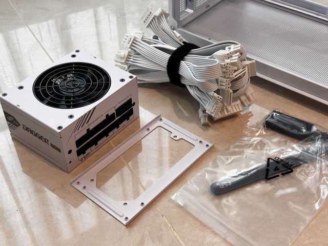 包裝內附轉ATX電源支架,線材使用純白扁線,而且連接頭都是白的。