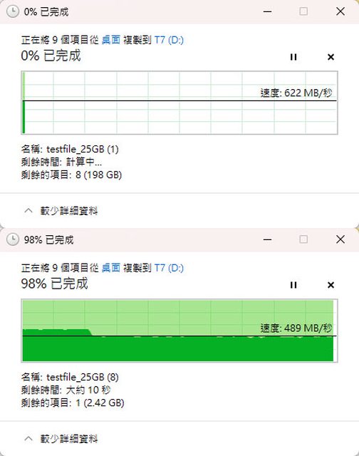 ▼第1次複製狀況如下圖,起始速度622MB/s,約在22%(44GB)處降速到489MB/s直到結束
