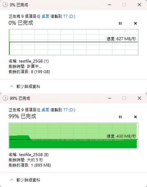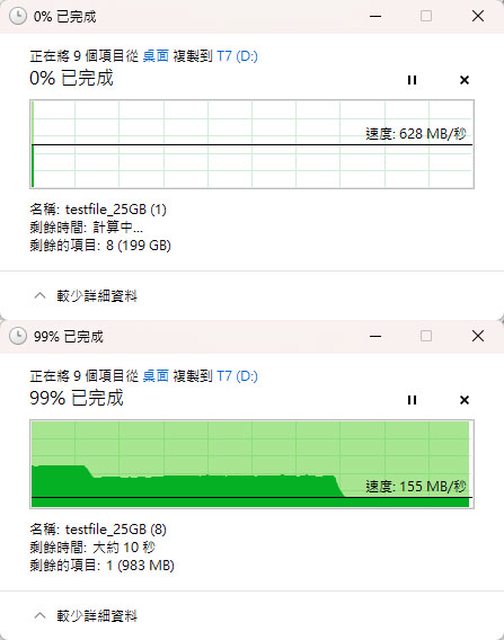 ▼第3次複製狀況如下圖,起始速度628MB/s,約在13%(26GB)處第一次降速,約在