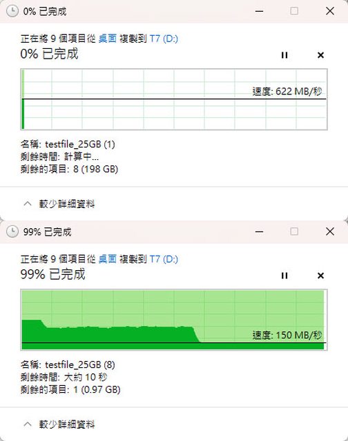 ▼檔案複製測試,每次從系統碟拉8個25GB檔案,連續複製直到磁碟空間用完,複製開始