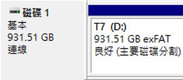▼磁碟標籤T7,預設exFAT格式,在Windows磁碟管理內實際可用容量為931.51GB(因為廠