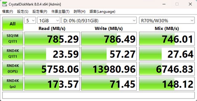 ▼CrystalDiskMark預設(NVMe)+Mix(R70%/W30%)傳輸速度測試