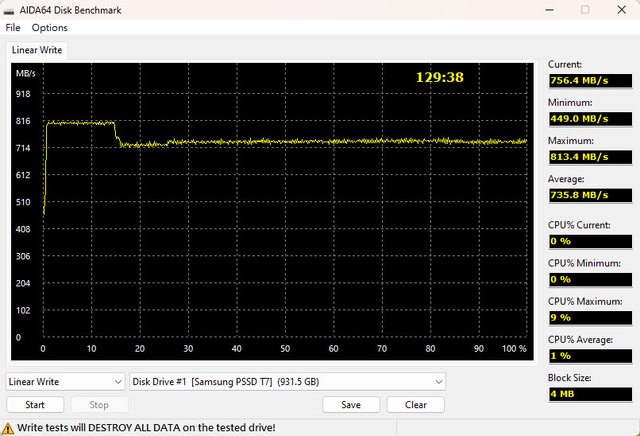 ▼AIDA64 Disk Benchmark連續寫入測試,最高速度813.4MB/s,最低速度449MB/s,測試