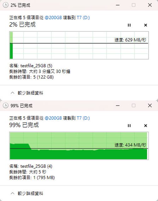 ,約在14%(17.5GB)處降速,結束前速度稍微上升至434MB/s