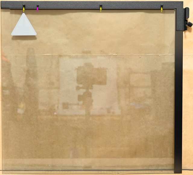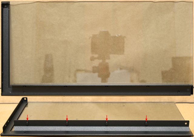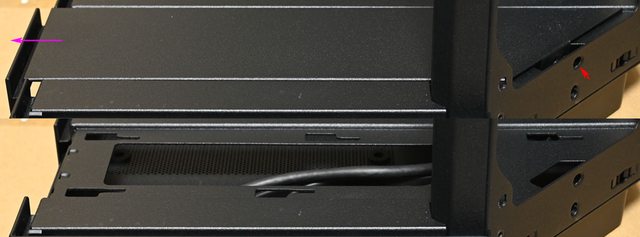 ▼左艙強化玻璃側板背面上方金屬條有3個固定用球狀卡榫(黃色箭頭)及1個定位銷(紫色