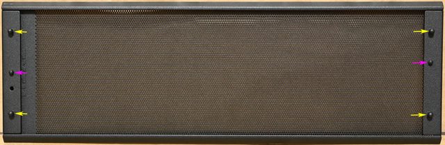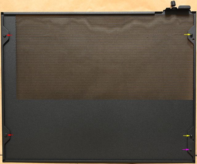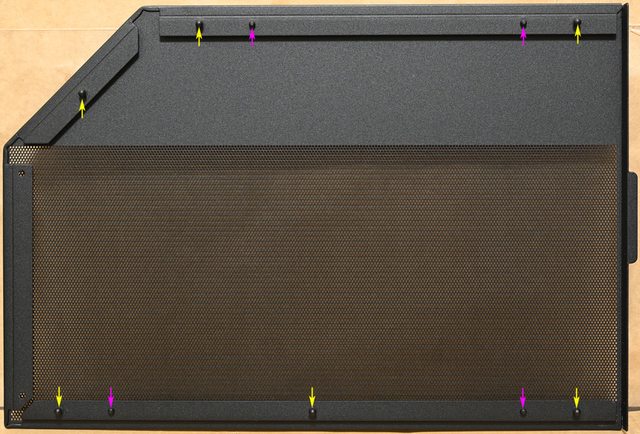 ▼頂部網孔板背面配置6個球狀卡榫(黃色箭頭)及4個定位銷(紫色箭頭),安裝時定位銷會