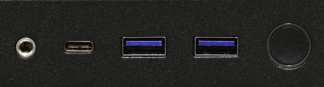 3.5mm插座、1個USB3.2 Type-C、2個USB3.2 Type-A、電源按鈕/電源指示燈(外環光圈)。