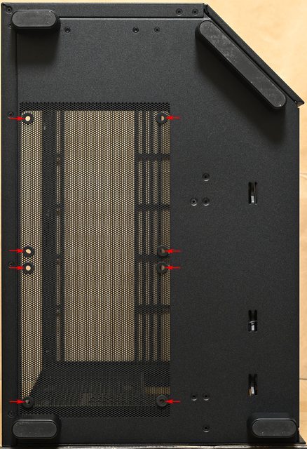 ▼機殼底部3短1長橢圓腳座有防滑墊,左艙底部網狀通風口配置2個140mm風扇的8個固定