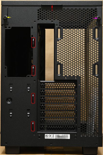 ▼機殼後方靠近中間處有4個線路固定架(紅色方框),最上面有固定左艙側板(紫色箭頭)/