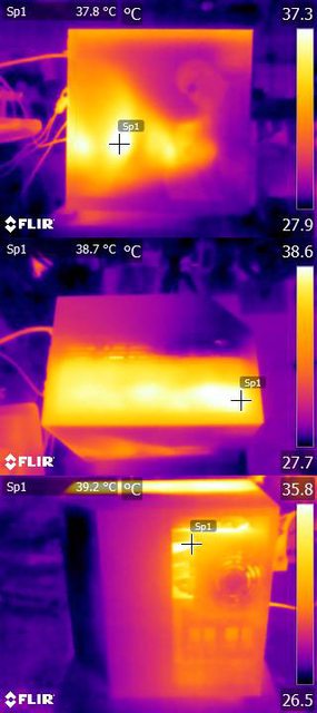 ▼CPU+GPU高負載30分鐘後的左側(上)、頂部(中)、右側(下)的紅外線熱影像圖