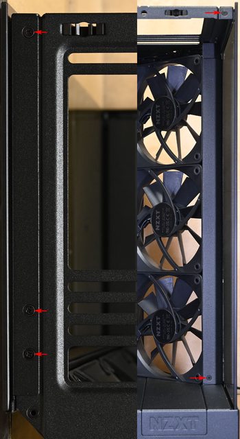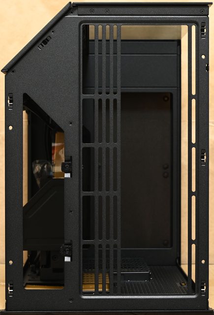 ▼機殼左艙頂部長條形固定孔可裝3個120mm或2個140mm風扇,水冷排可裝到360mm。右艙