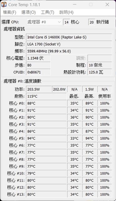 AVX FPU 燒機,功耗為 200W 工作溫度 P 核 89~94