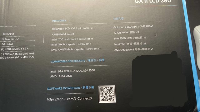 在包裝的背面可以看見詳細的規格說明,右下方也有QR code可以掃描安裝水冷軟體 L-co