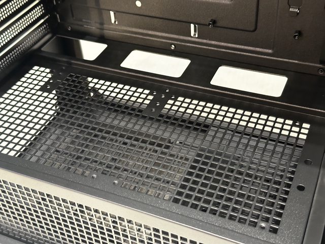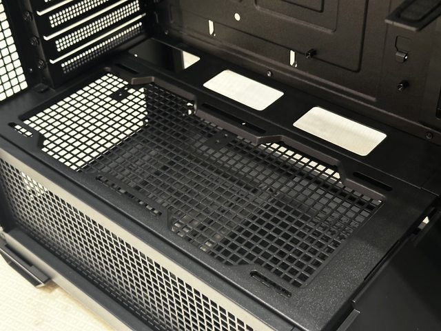 拆除風扇架後可看到電源倉上方設有PCI-E延長線底座的安裝孔,目測也設有2個12cm風扇