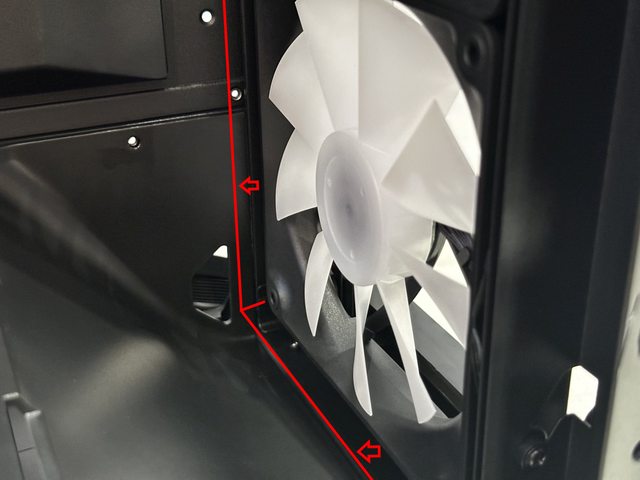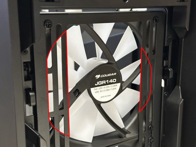 被鎖孔阻礙,但受限於前方防塵網的距離,只能安裝標準25mm厚度的風扇。
